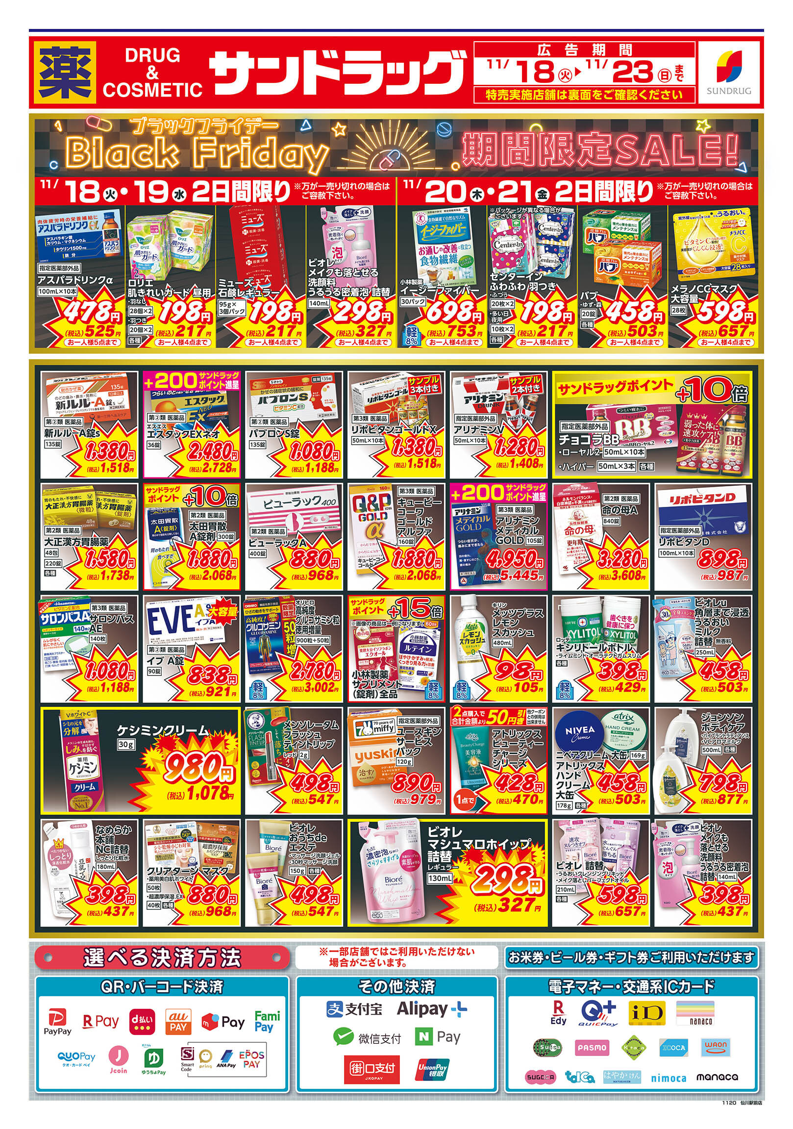iD、nanaco、楽天Edy、QUICPay+、WeChat Pay、ALIPAY、PayPay、auPAY、クオ・カードペイ、メルペイ、NAVER Pay