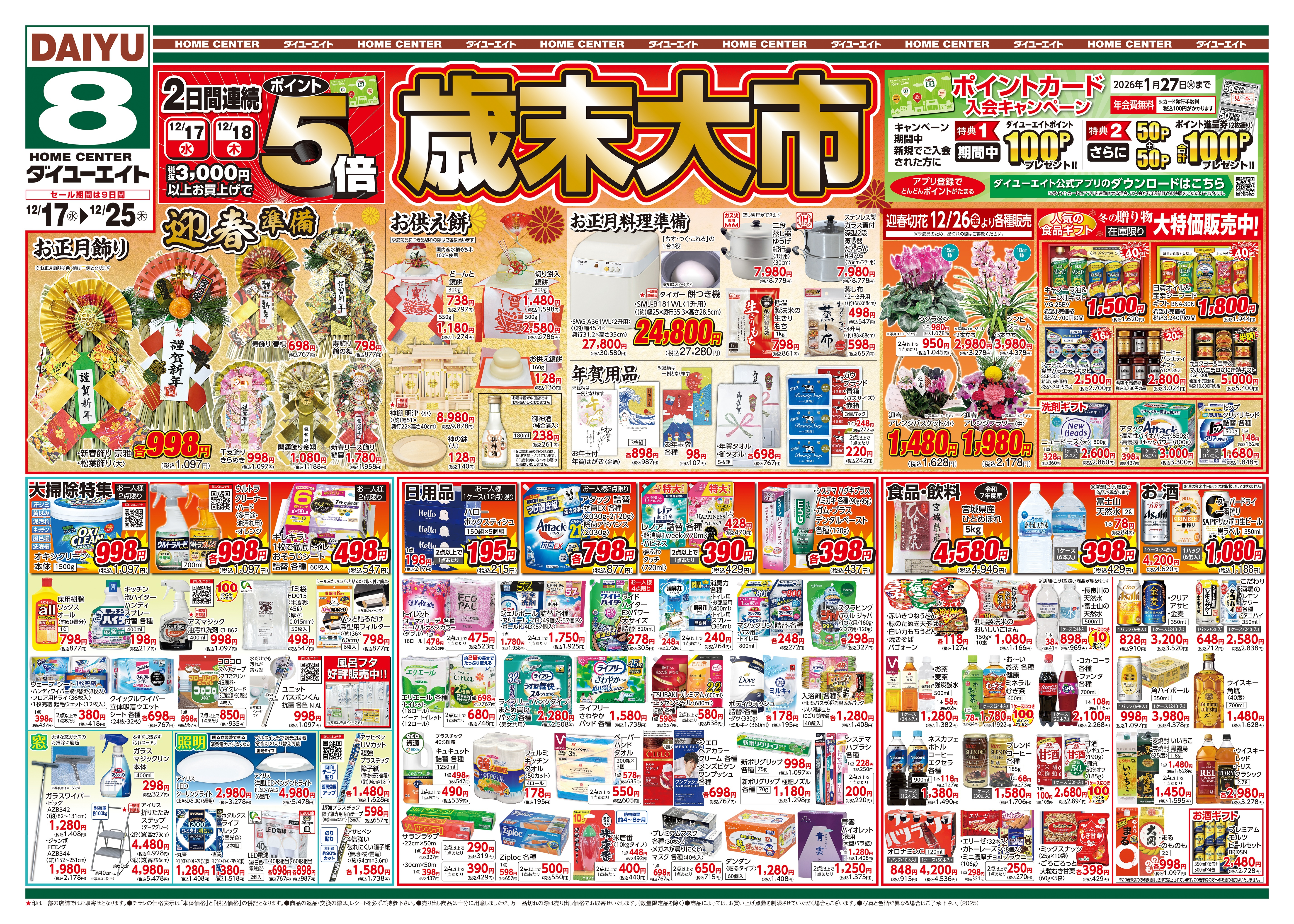 お買い上げ税抜100円につき1ポイント進呈。500ポイントでダイユーエイトポイント券を1枚進呈します。ポイント券3枚で1,000円分のお買い物券としてご利用になれます。