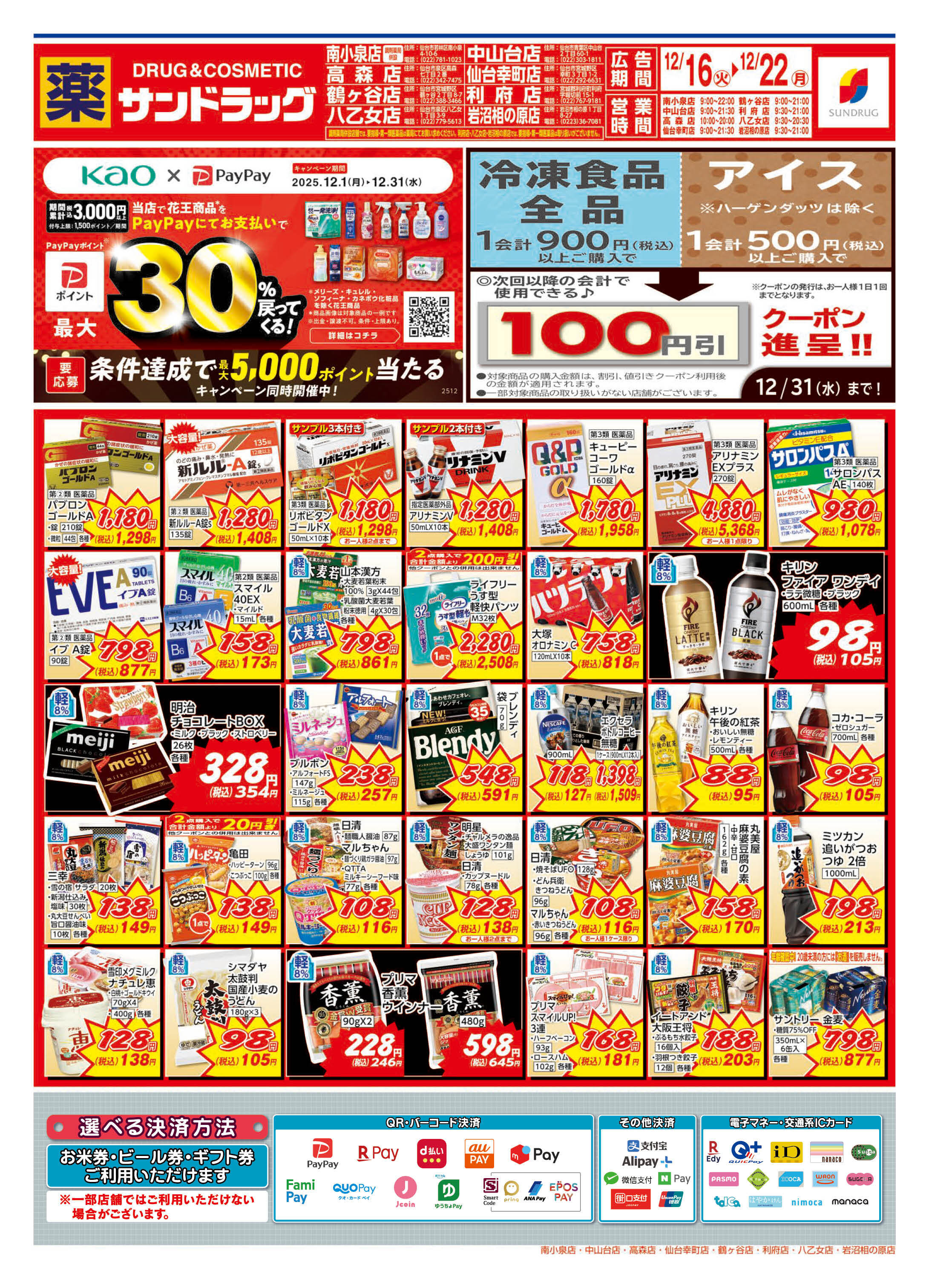 iD、nanaco、楽天Edy、QUICPay+、WeChat Pay、ALIPAY、PayPay、auPAY、クオ・カードペイ、メルペイ、NAVER Pay