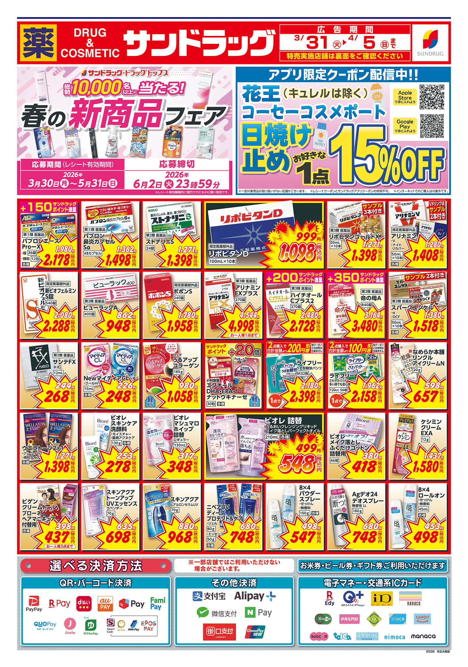 iD、nanaco、楽天Edy、QUICPay+、WeChat Pay、ALIPAY、PayPay、auPAY、クオ・カードペイ、メルペイ、NAVER Pay