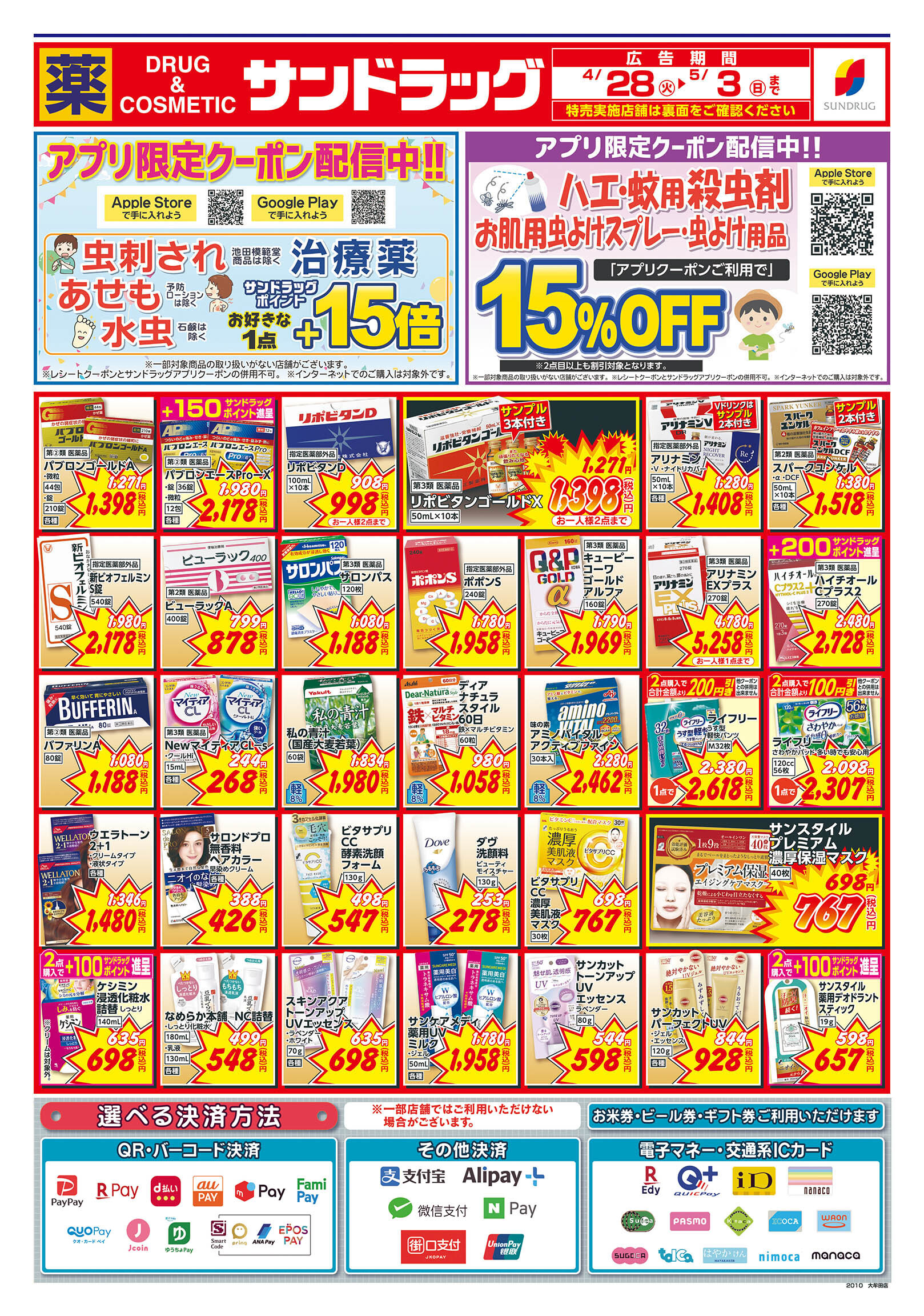 iD、nanaco、楽天Edy、QUICPay+、WeChat Pay、ALIPAY、PayPay、auPAY、クオ・カードペイ、メルペイ、NAVER Pay