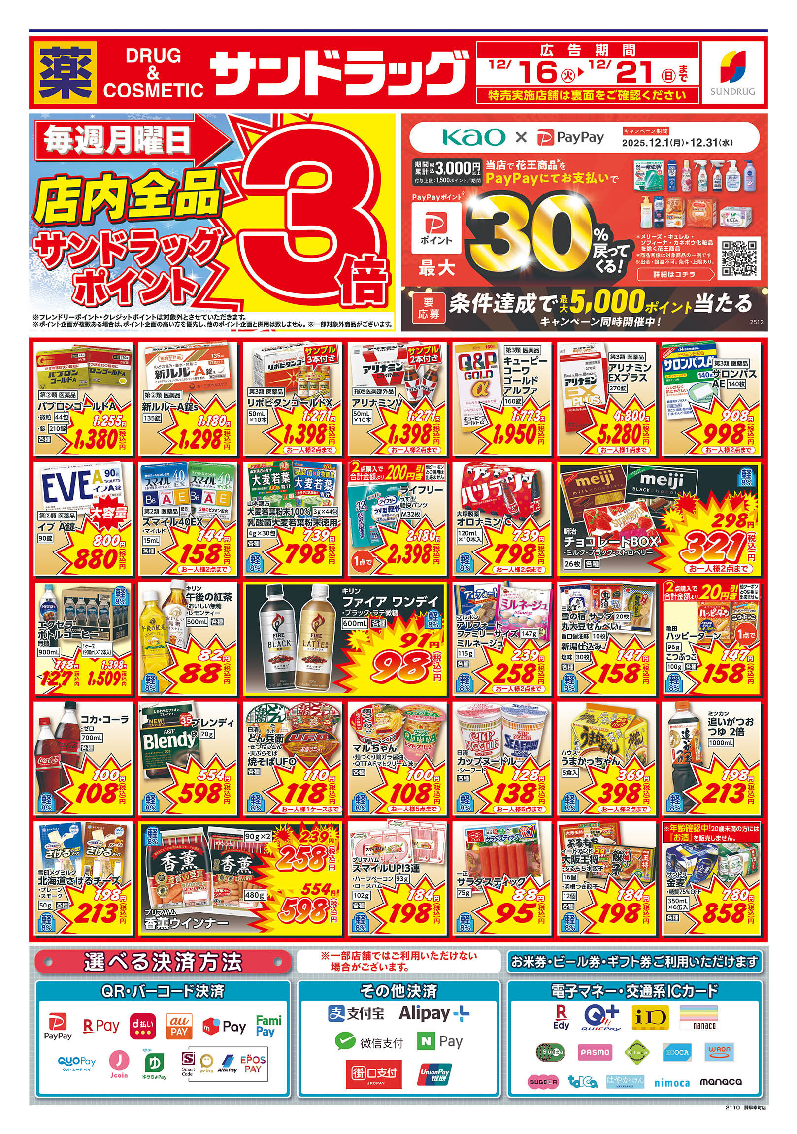 iD、nanaco、楽天Edy、QUICPay+、WeChat Pay、ALIPAY、PayPay、auPAY、クオ・カードペイ、メルペイ、NAVER Pay