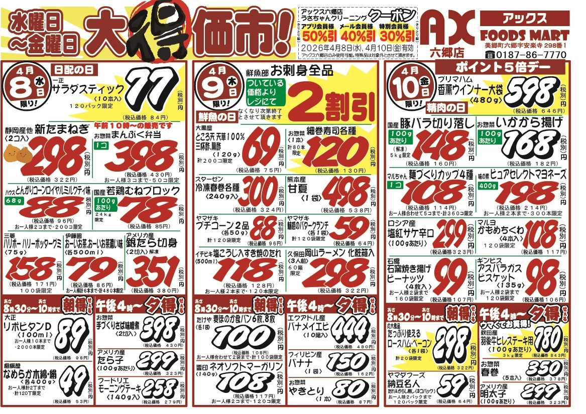 アックスフーズマートの店舗・チラシを一覧形式で掲載しています。店舗情報やオトクなチラシを見たいアックスフーズマートのお店を簡単にチェックできます。