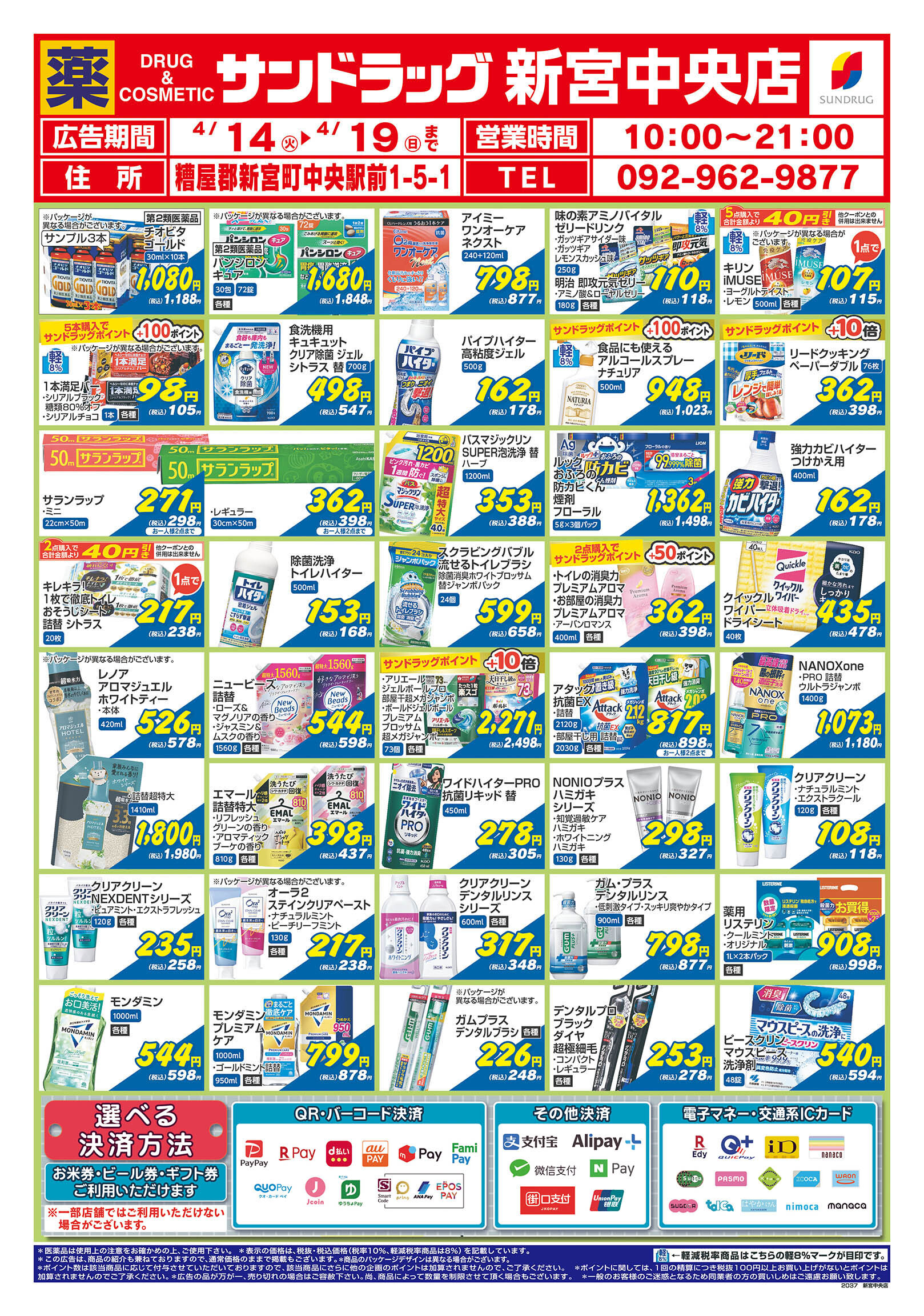 iD、nanaco、楽天Edy、QUICPay+、WeChat Pay、ALIPAY、PayPay、auPAY、クオ・カードペイ、メルペイ、NAVER Pay