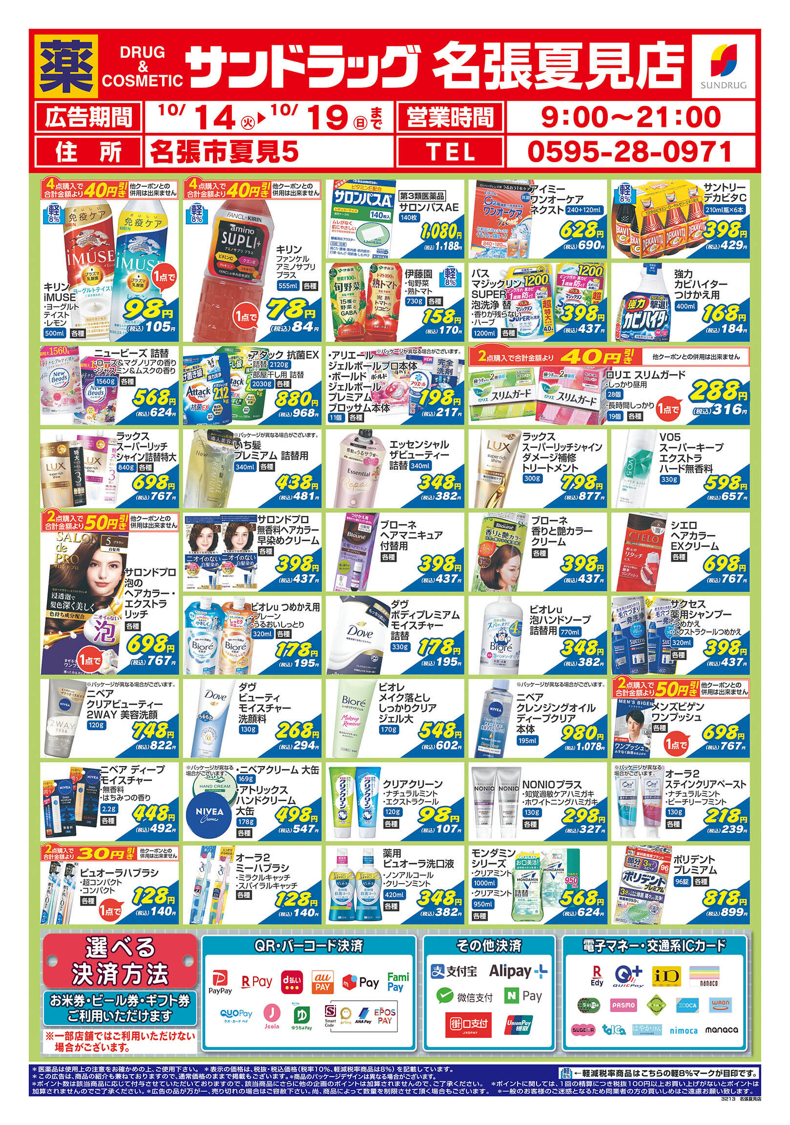 iD、nanaco、楽天Edy、QUICPay+、WeChat Pay、ALIPAY、PayPay、auPAY、クオ・カードペイ、メルペイ、NAVER Pay