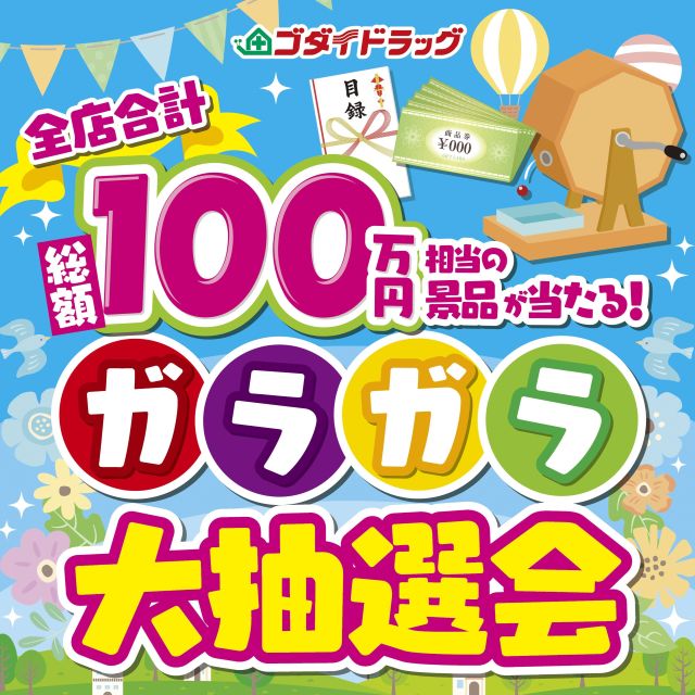 総額100万円相当の景品が当たる、恒例のガラガラ大抽選会を開催。期間中、商品お買上げ500円(税込)ごとに抽選補助券を1枚差し上げます。10枚たまると1回抽選していただけます。