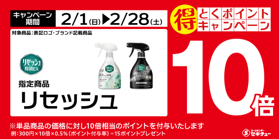 対象期間中(2月1日㈰~2月28日㈯)は、【リセッシュ(指定商品) ポイント10倍】となります。