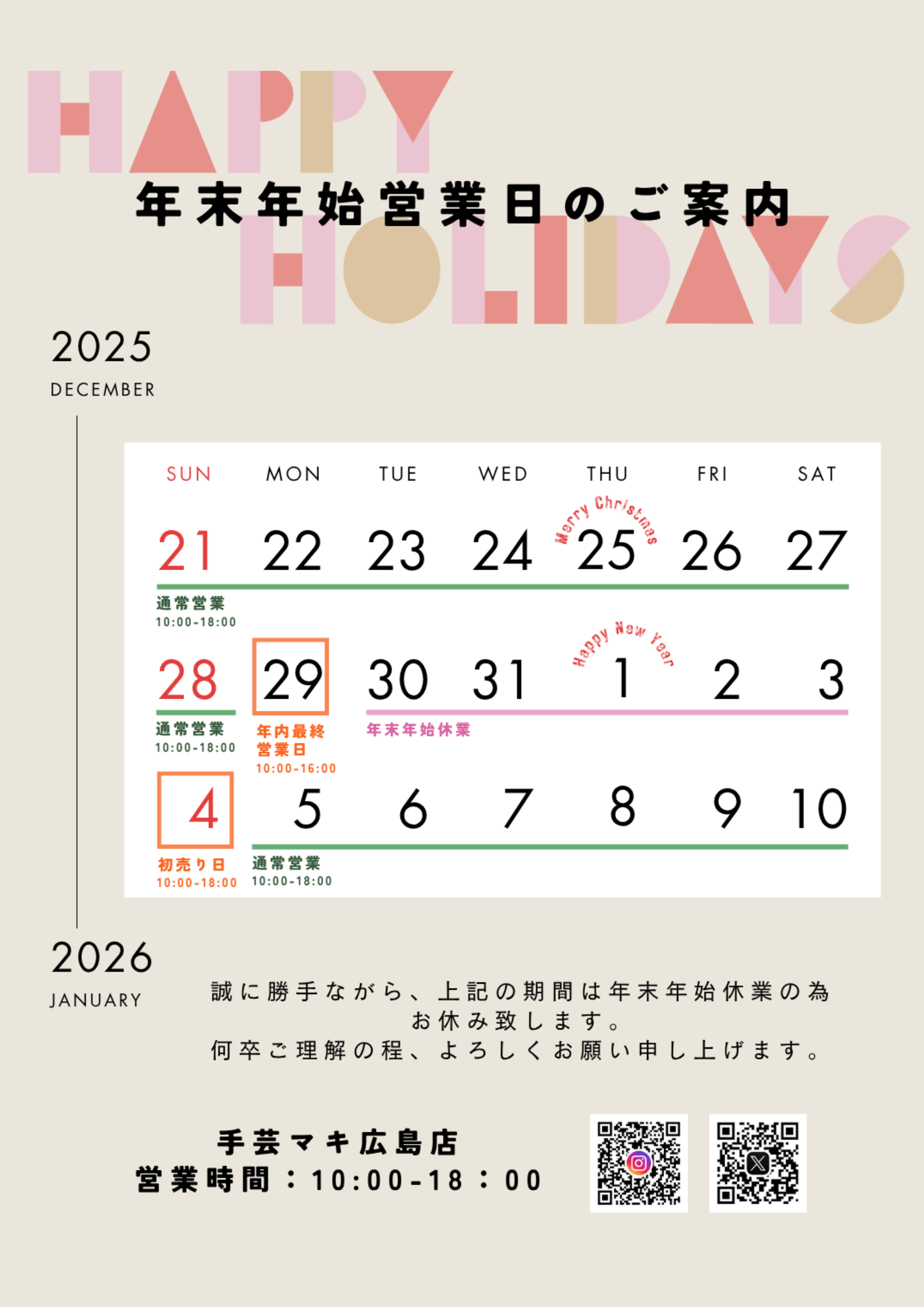 12/29(月) 短縮営業[10:00~16:00]