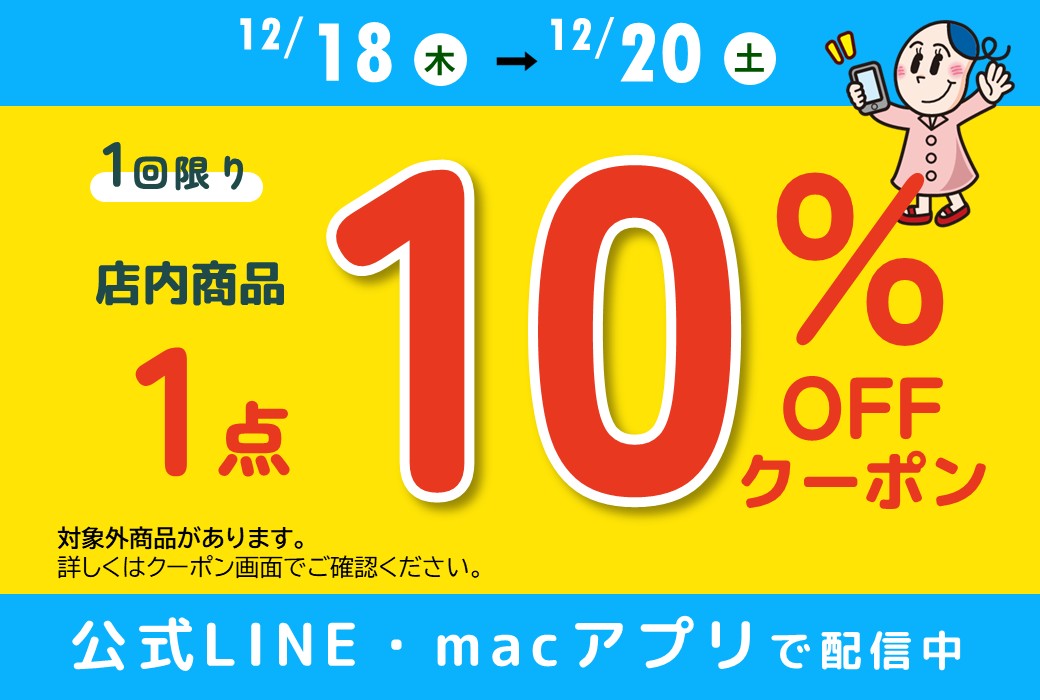 【12/18~12/20まで】\店内商品1点10%オフクーポンをプリで配信中/
