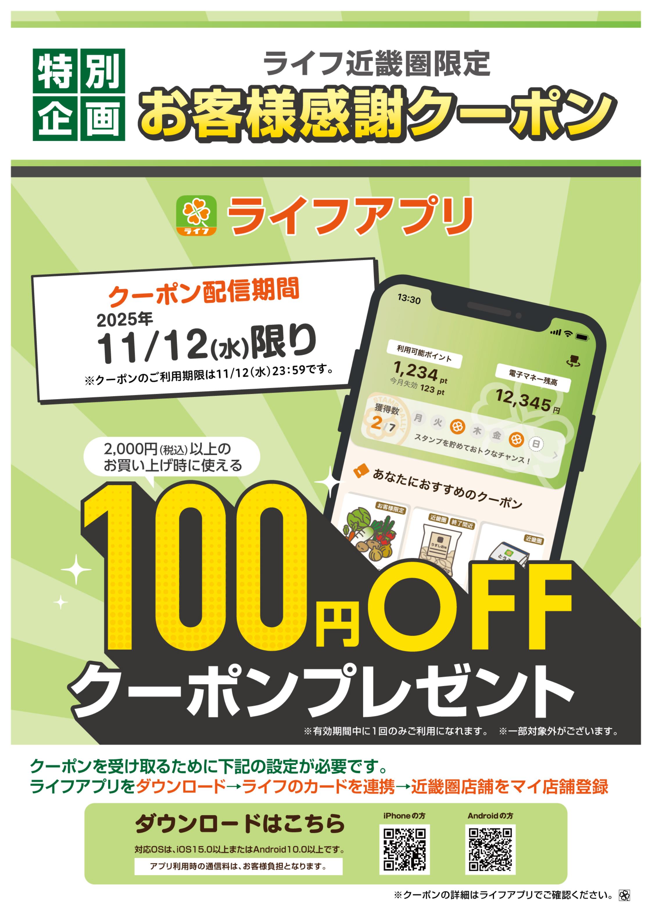 ライフアプリにて、2025年11/12(水)限り2,000円(税込)以上のお買い上げ時に使える100円offクーポンを11/12(水)に配信!
