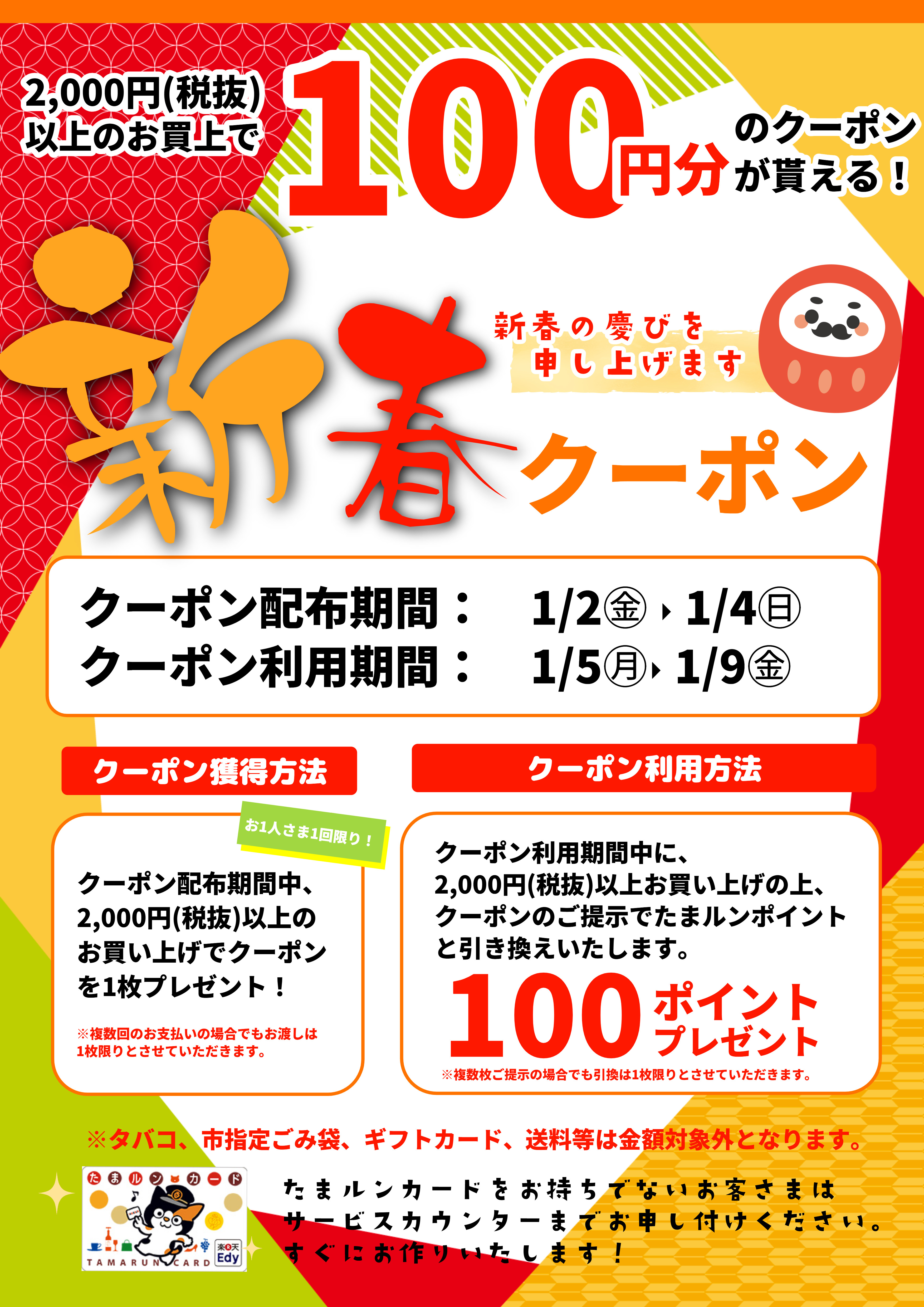 クーポンご利用で100円分のお買い物に使えるたまルンポイントをプレゼント