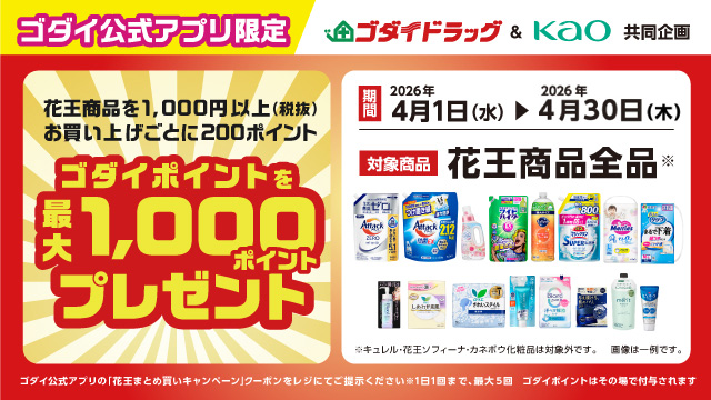 期間中、ゴダイ公式アプリで「花王まとめ買いキャンペーン」クーポンを配信。ゴダイドラッグ各店で、一度に花王商品を税抜1,000円以上お買い上げ時に、クーポンをご提示でゴダイポイント200ポイントをプレゼント!※1日1回、期間中最大5回まで。