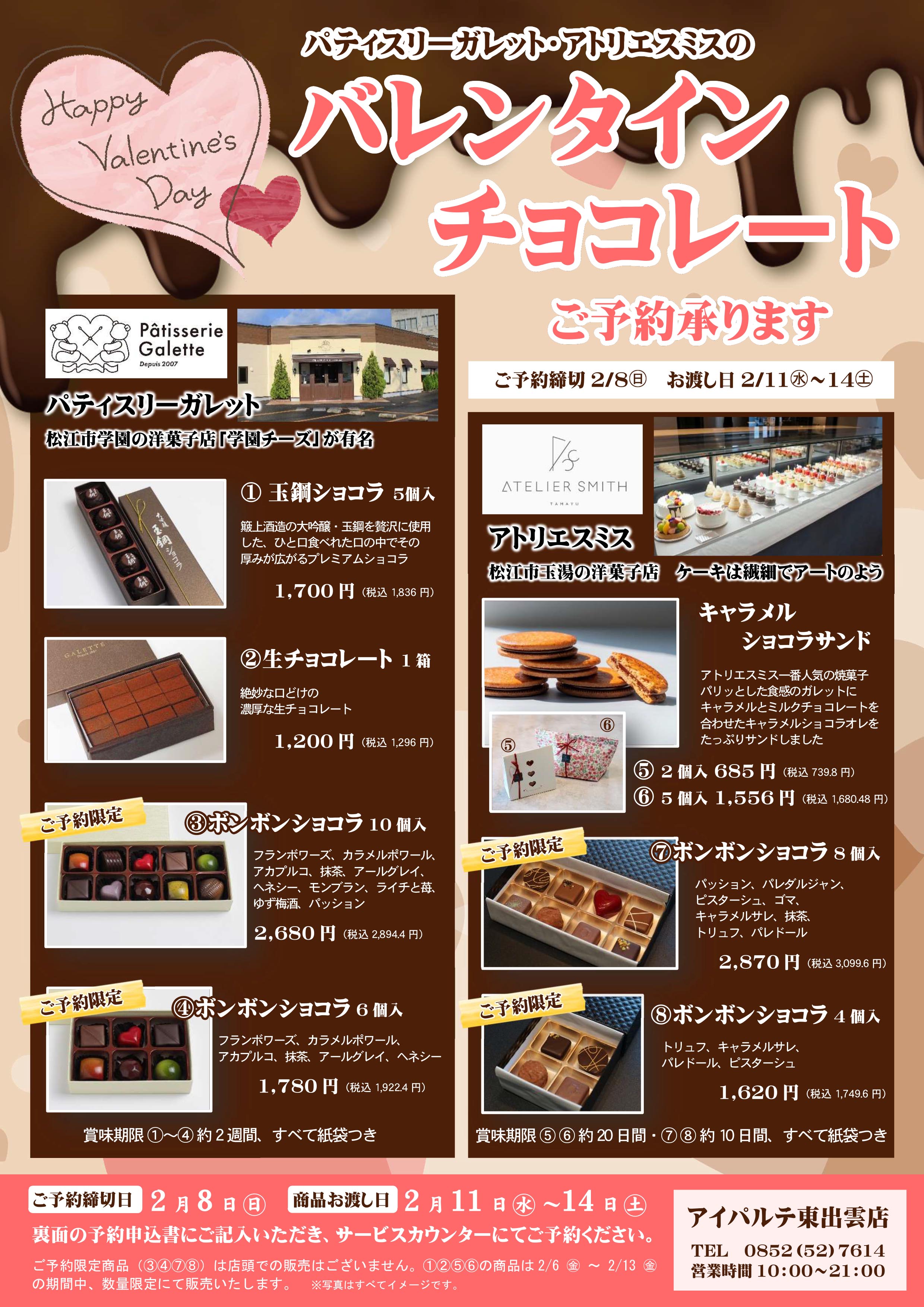 松江市の洋菓子店「パティスリーガレット」「アトリエスミス」のバレンタインチョコレートのご予約を承ります。