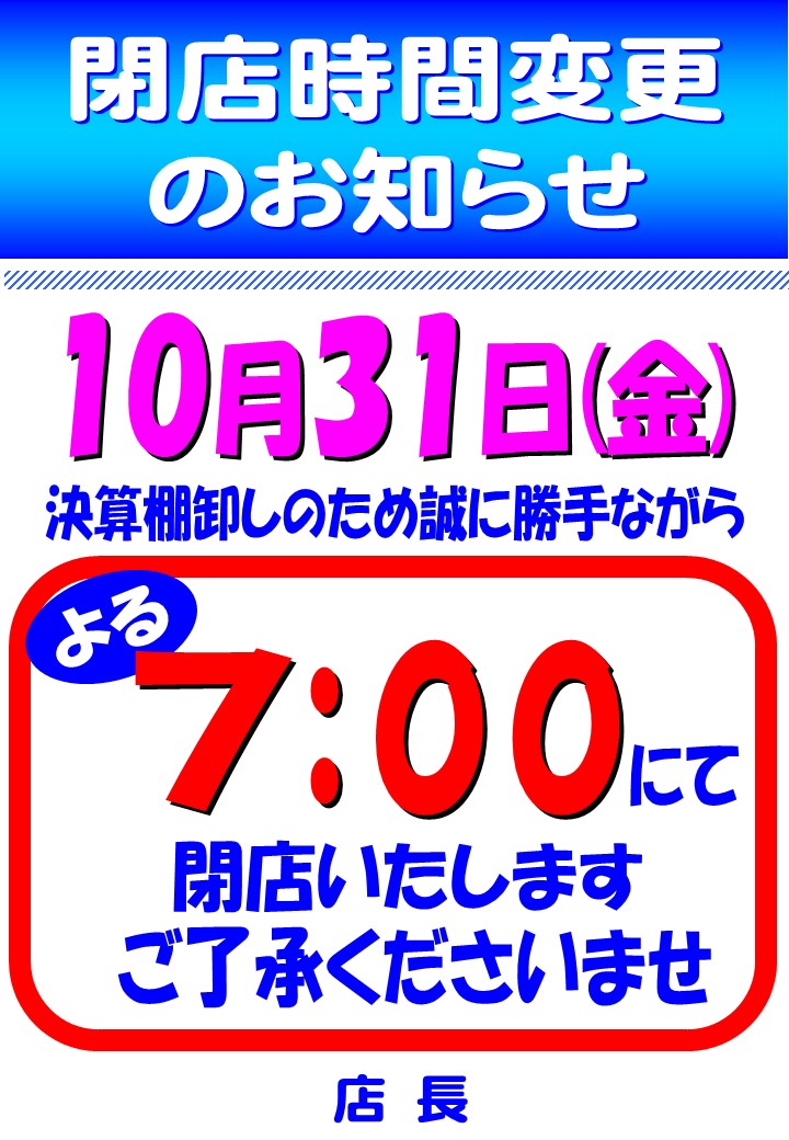 10月31日(金)営業時間変更のお知らせ