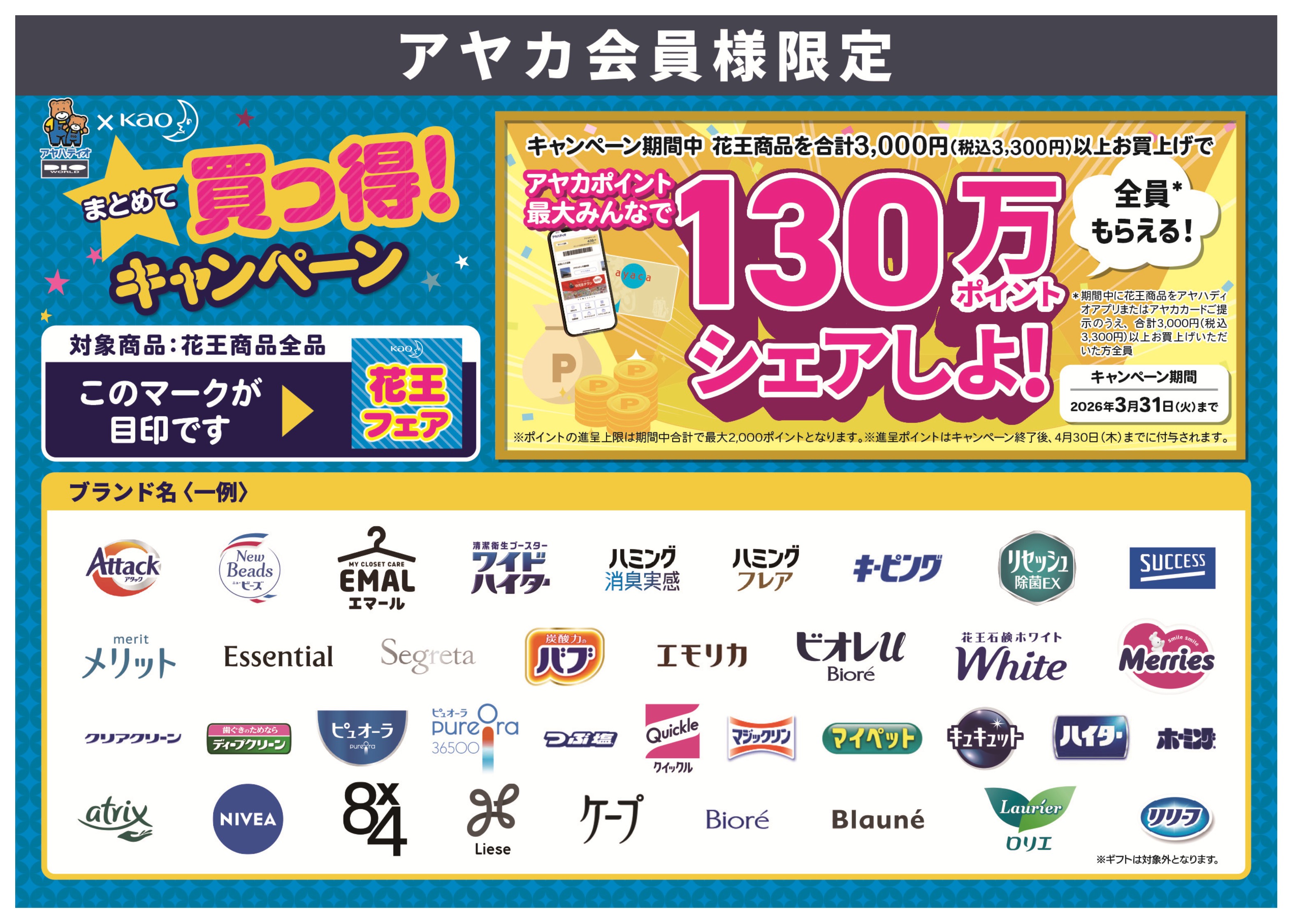 キャンペーン期間中、花王商品を合計3,000円(税込3,300円)以上お買上げで