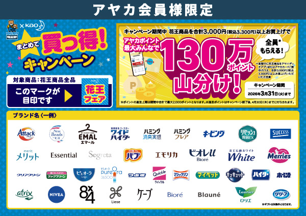 キャンペーン期間中、花王商品を合計3,000円(税込3,300円)以上お買上げで