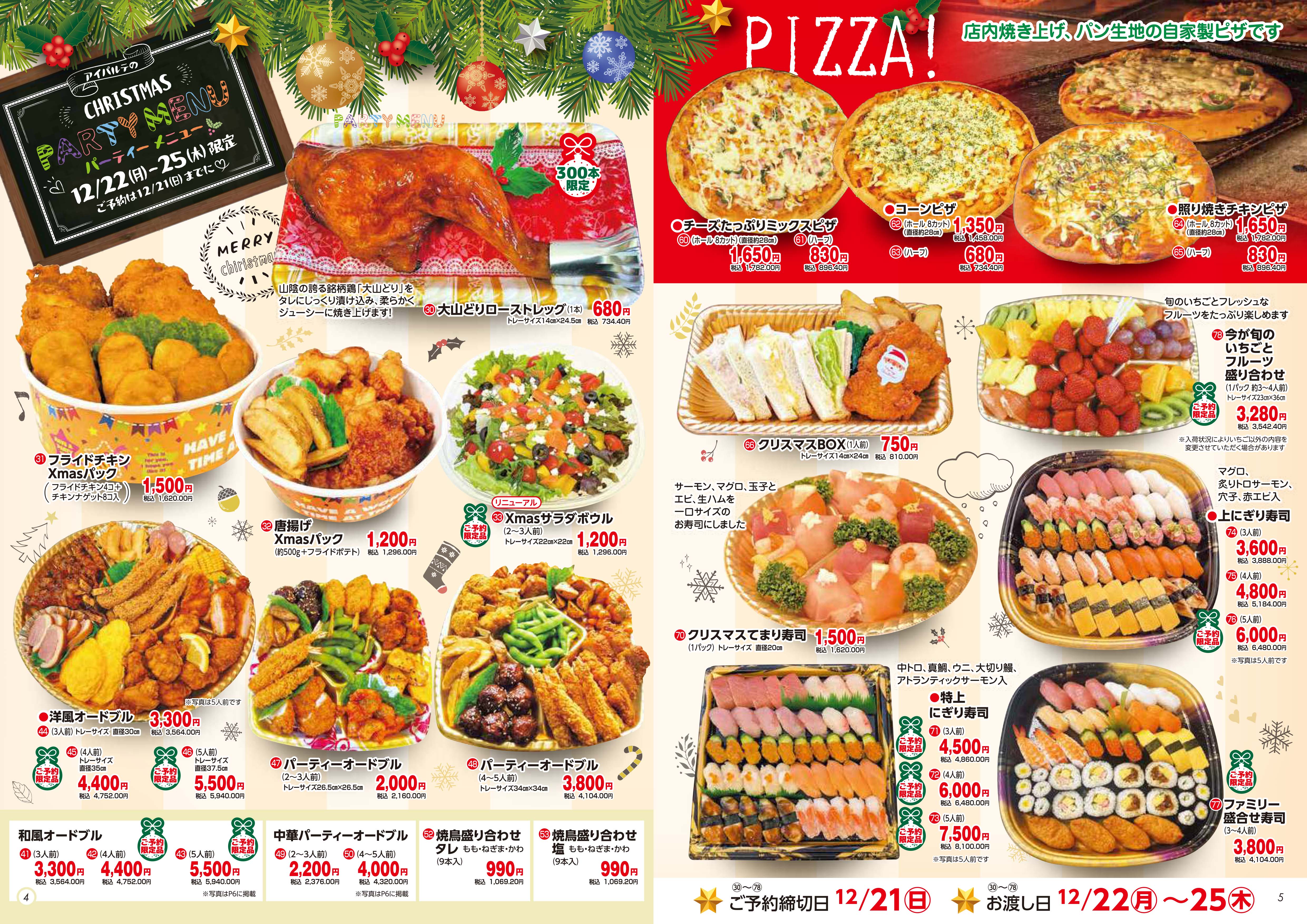 ローストチキンにフライドチキン、ピザにお寿司など、クリスマスのご予約は12/21㊐まで!