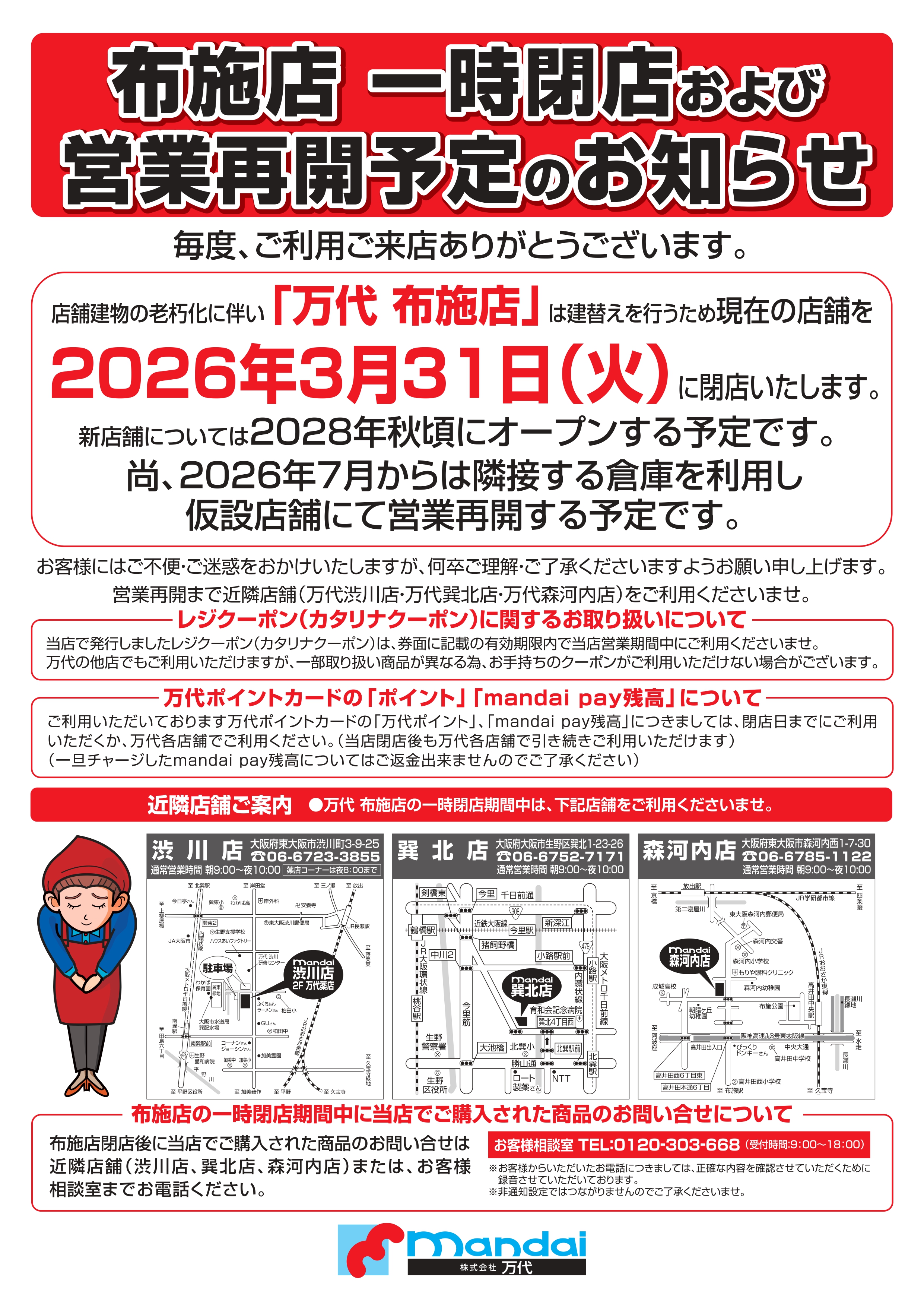 店舗建物の老朽化に伴い万代布施店は建替えを行うため現在の店舗を2026年3月31日(火)に閉店いたします。