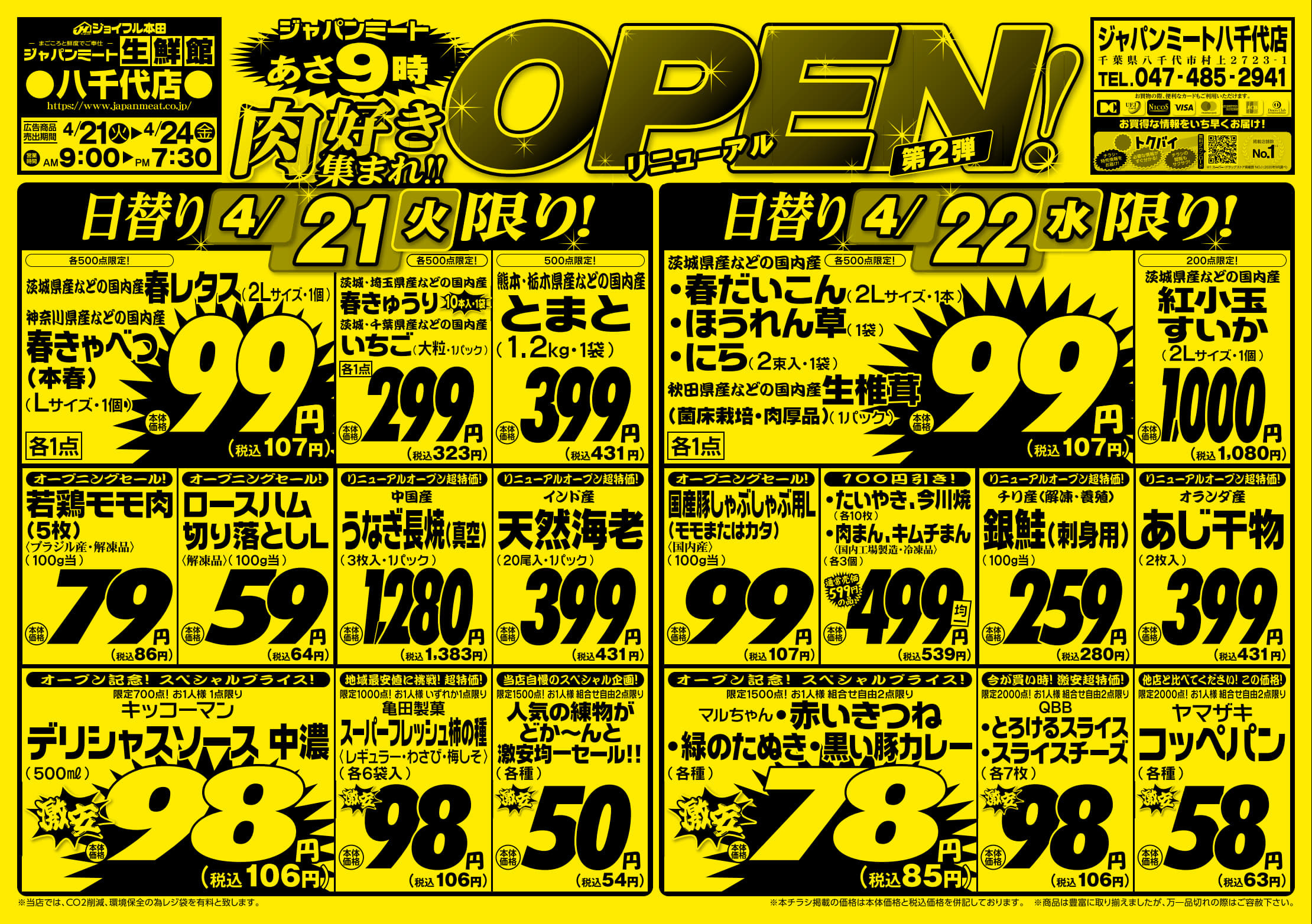 4:30~25:00 ※一時お休みさせていただく場合もございますので、予めご了承ください。 広告特売は10時から21時までとなります。 21時から翌日10時までは広告の価格と異なる場合がございます。