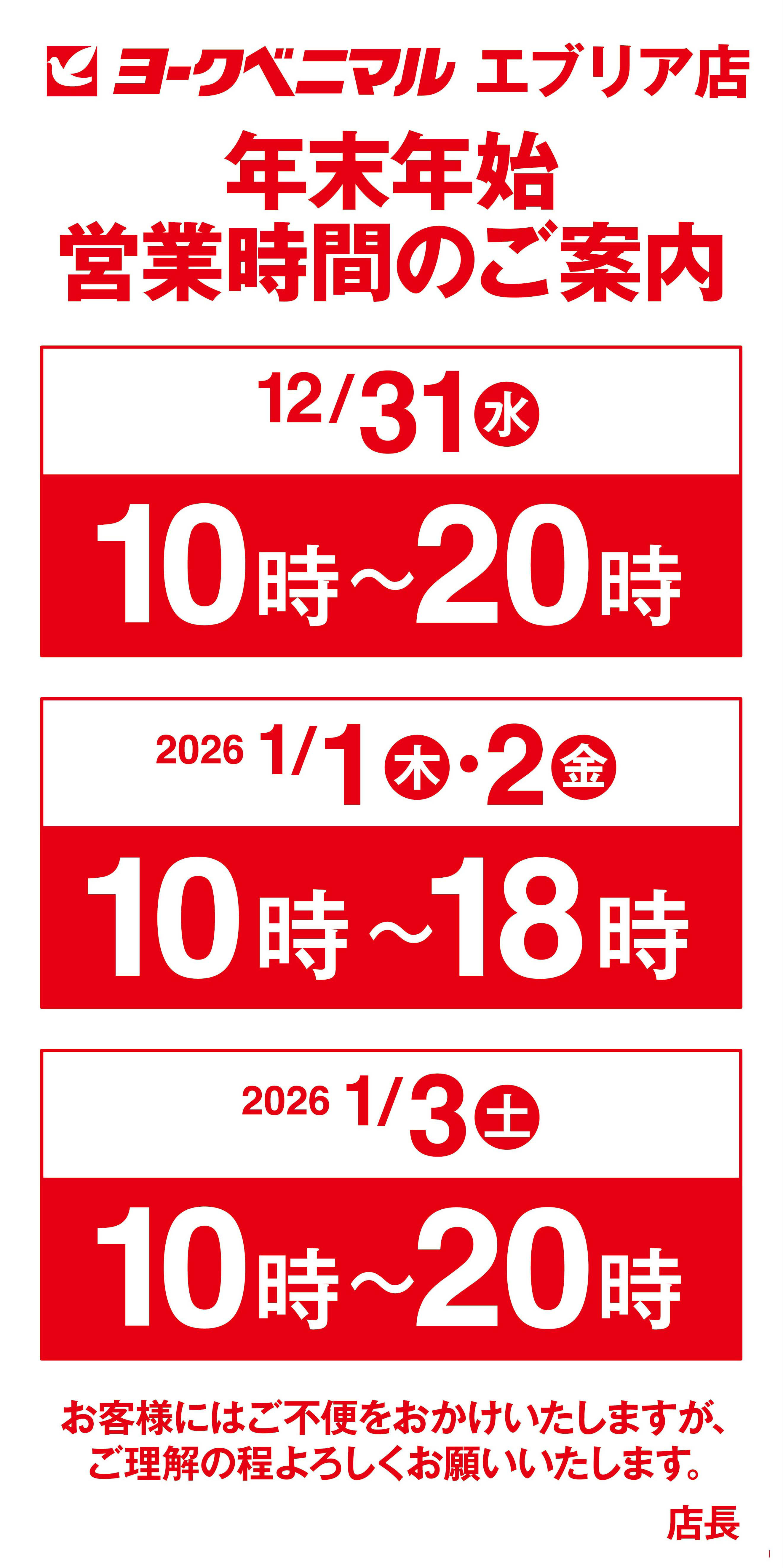 年末年始の期間中、営業時間が変更になっている可能性があります。詳しくはホームページ等をご確認ください。