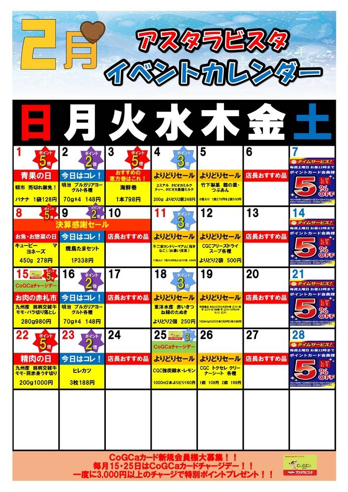 アスタラビスタCoGCaカード ※お買い上げ金額200円(税抜)ごとに1ポイント進呈致します。 ※CoGCa払い、または現金でお支払いいただいたお客様に限ります。