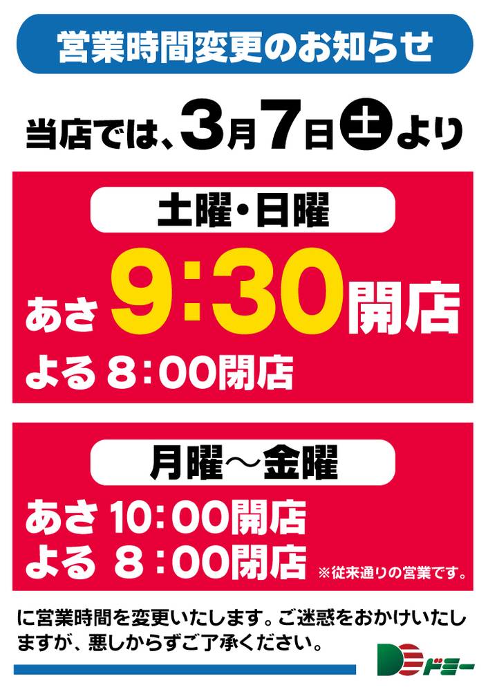 9:00〜21:00 ・『駐車場設置店舗』には、駐車券発行店舗も含まれます。 ・年末年始、または台風・大雪等の気象条件により営業時間を変更する場合がございます。 ・閉店前は店頭商品を店内に収納する為、通路が狭くなる場合がございます。