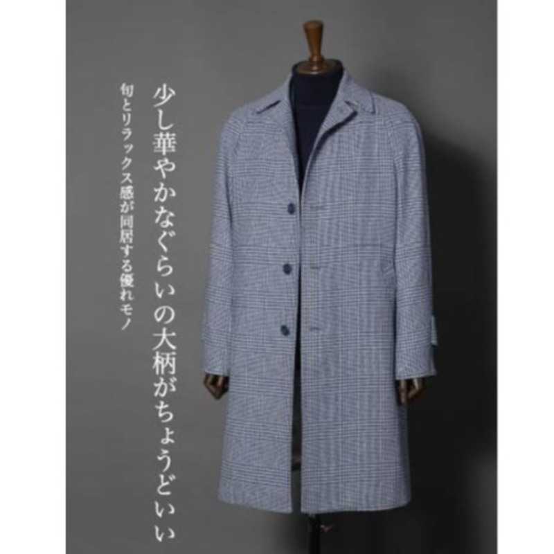 ライトネイビーの明るめな色調がモダンな印象のソフトツイードコート。大きなグレンプレイドは迫力がありま