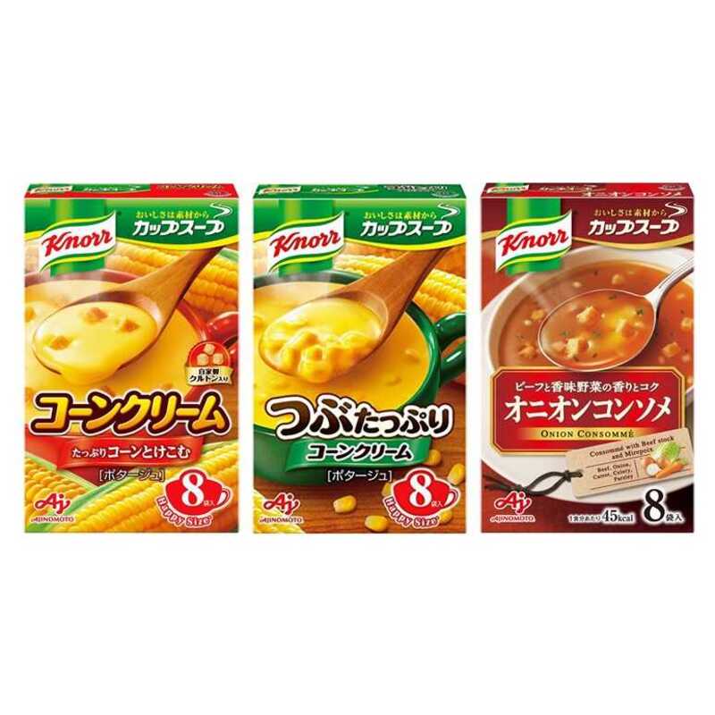 クノールカップスープ ・コーンクリーム ・つぶたっぷりコーンクリーム ・オニオンコンソメ