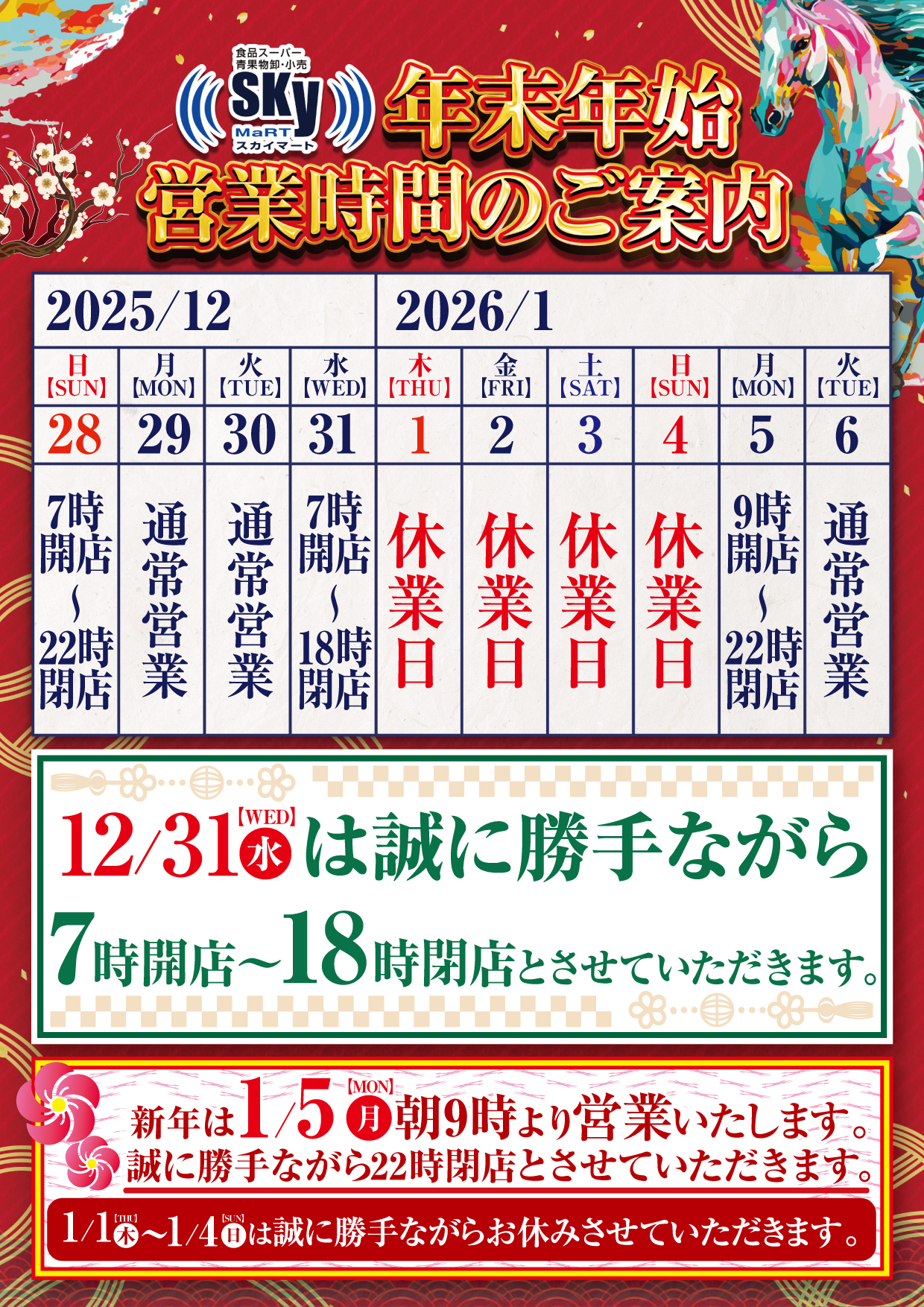 年末年始の期間中、営業時間が変更になっている可能性があります。詳しくはホームページ等をご確認ください。