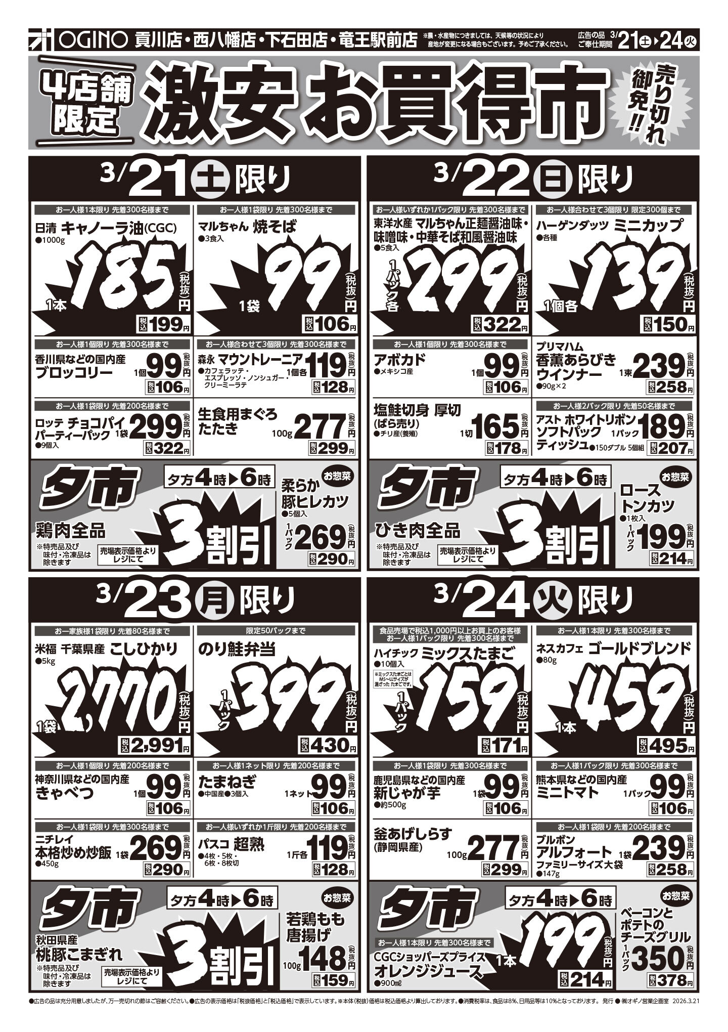 食品 9:00 / 衣料 10:00〜食品 21:00 / 衣料 20:00