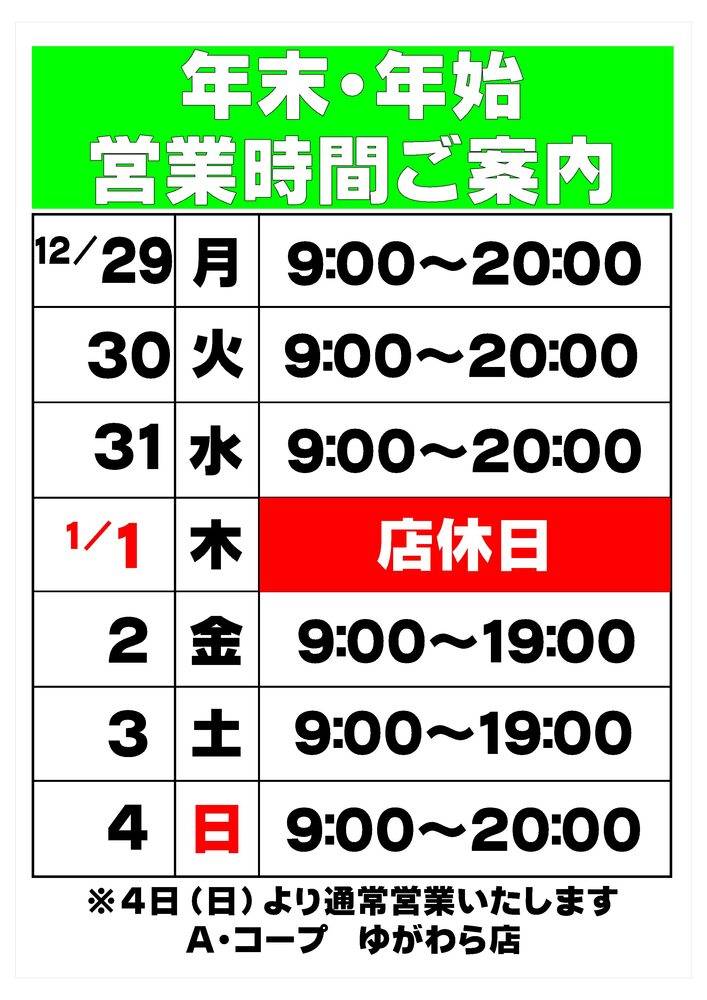 年末年始の期間中、営業時間が変更になっている可能性があります。詳しくはホームページ等をご確認ください。