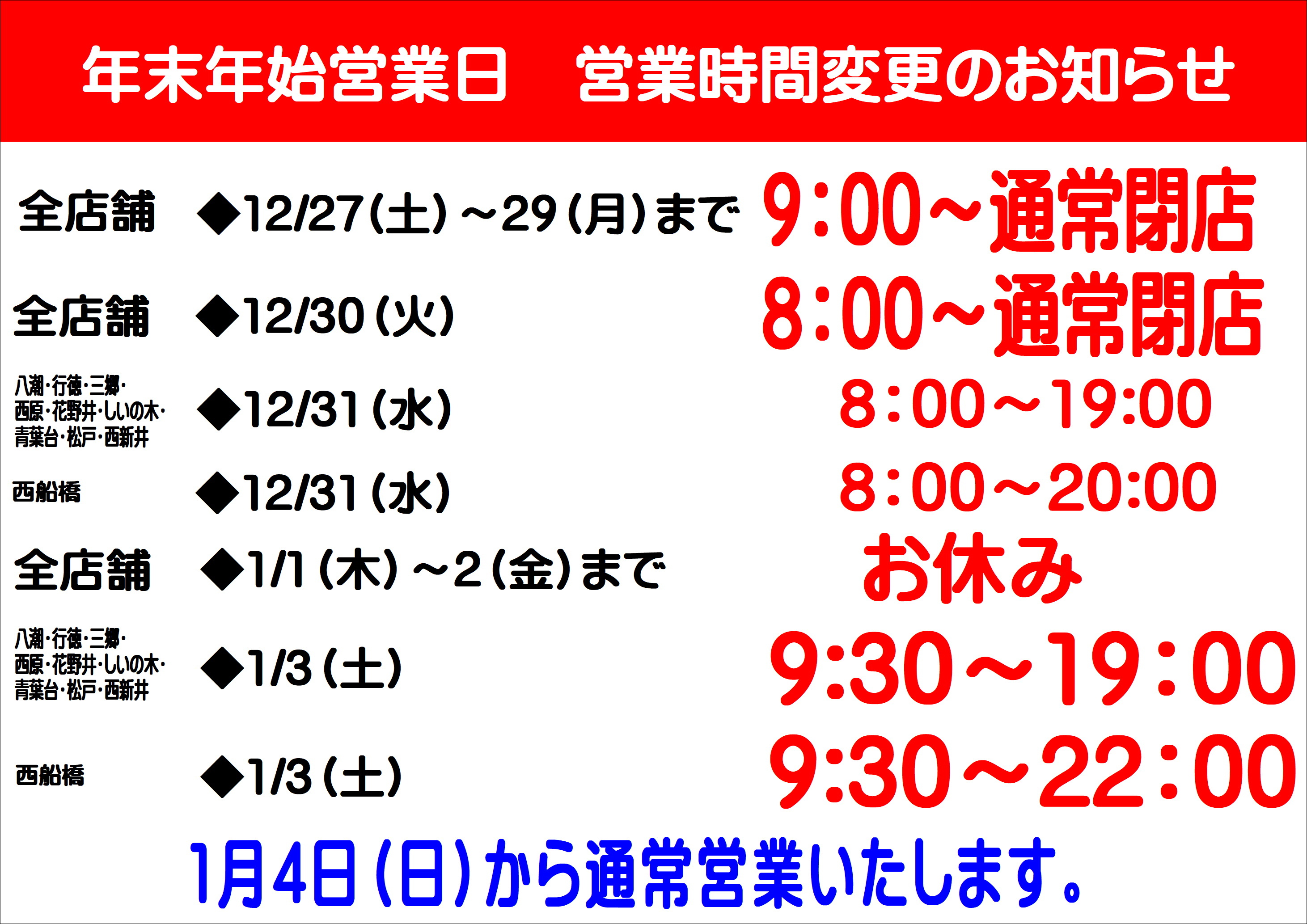年末年始の期間中、営業時間が変更になっている可能性があります。詳しくはホームページ等をご確認ください。