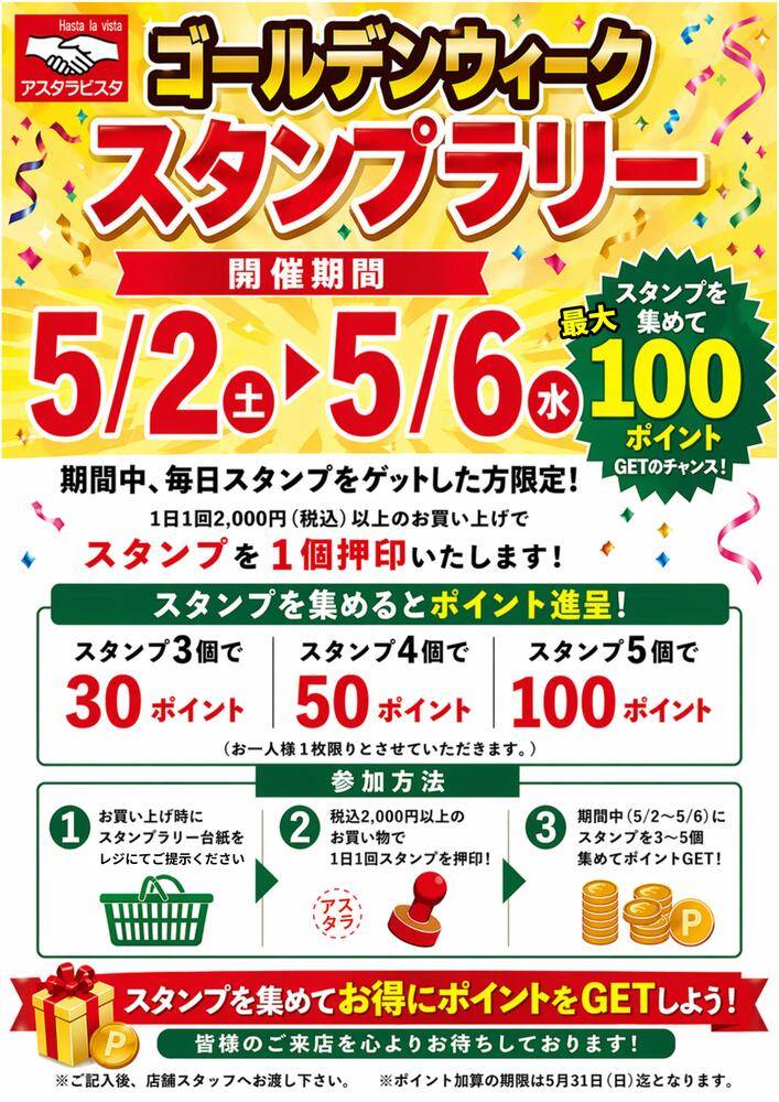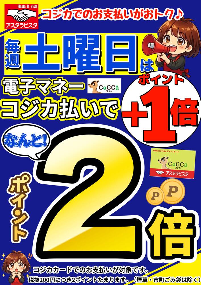 アスタラビスタCoGCaカード ※お買い上げ金額200円(税抜)ごとに1ポイント進呈致します。 ※CoGCa払い、または現金でお支払いいただいたお客様に限ります。