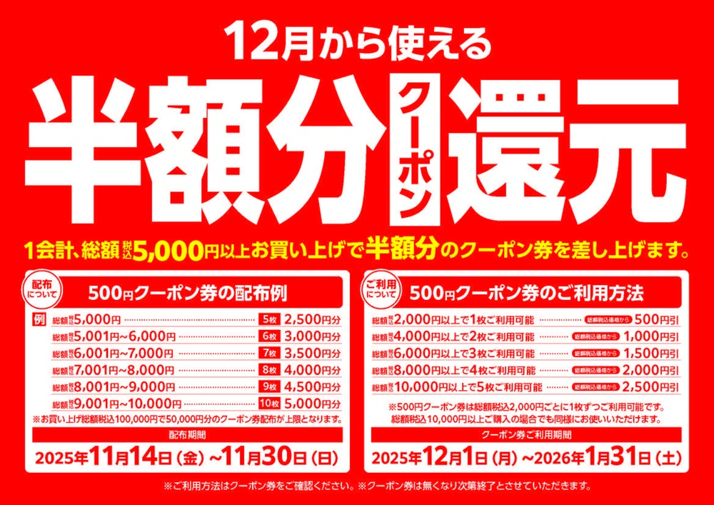 12月から使える、半額分クーポン還元!
