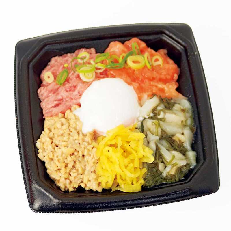 本まぐろ入り たたき・サーモンたたき・納豆等をのせた丼に、温泉玉子を合わせました。※写真はイメージです。