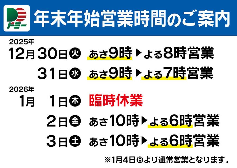 年末年始の期間中、営業時間が変更になっている可能性があります。詳しくはホームページ等をご確認ください。