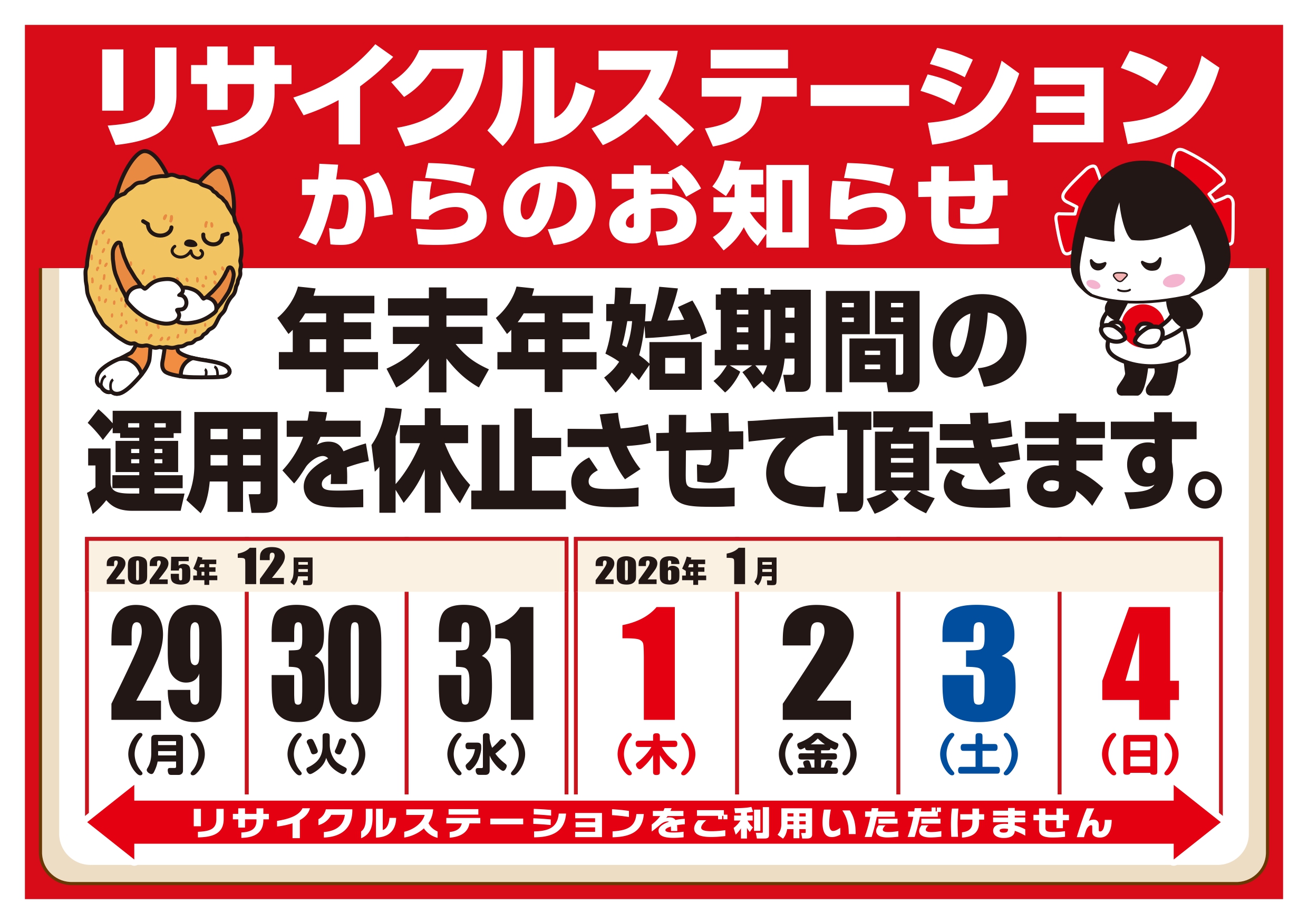 【リサイクルステーション】12月29日~1月4日休止のお知らせ