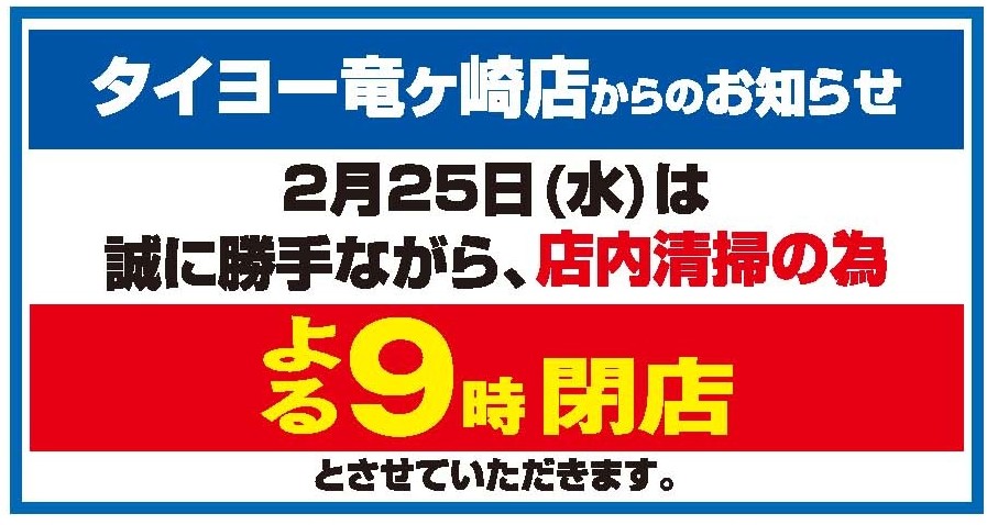 2月25日(水)営業時間変更のお知らせ